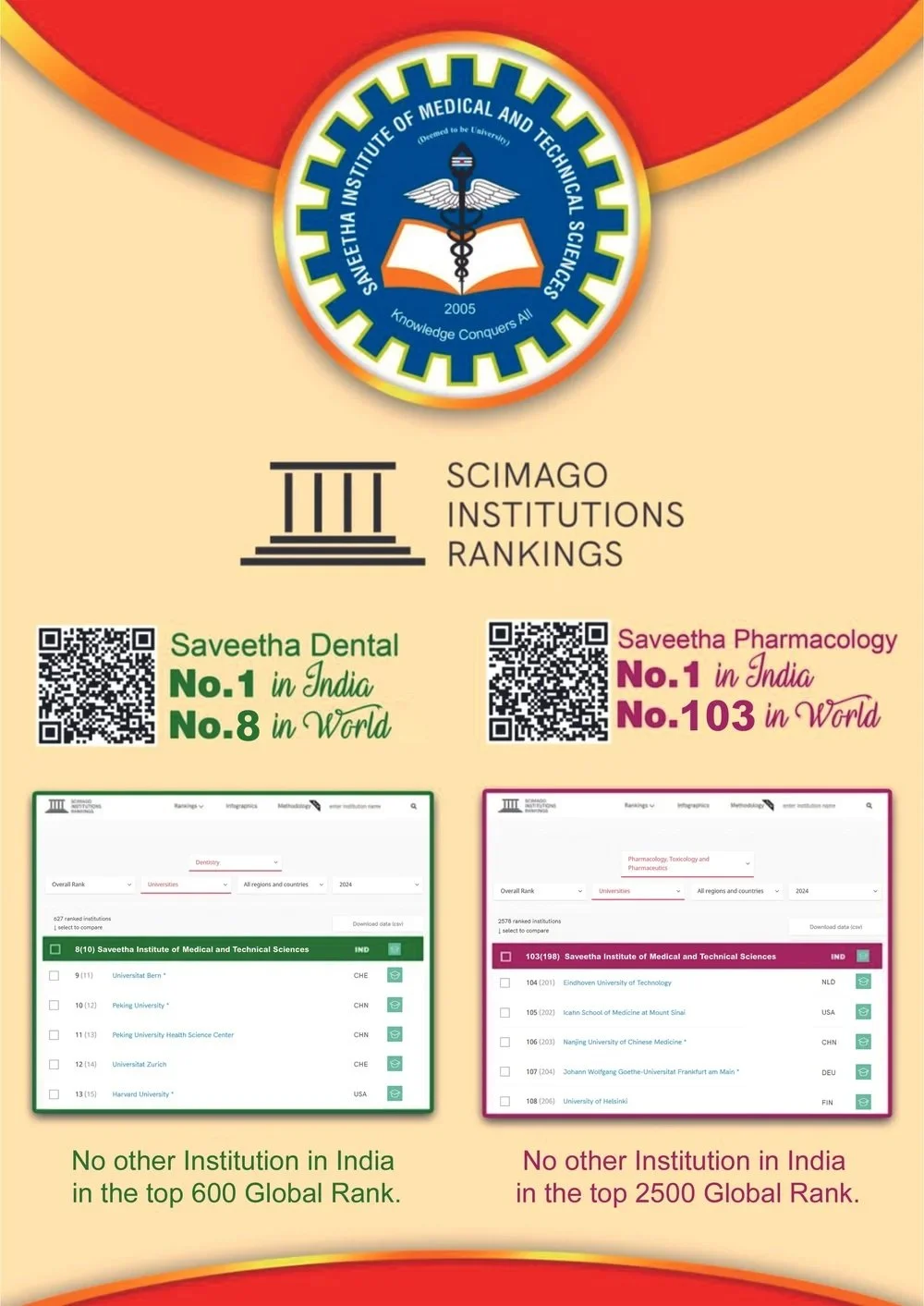 Saveetha Dental College, Chennai, Tamil Nadu, India, is one of the finest institutions in the world with a unique curriculum that is a spectacular fusion of the best practices of the East and West. It is our everlasting passion that has helped us train our students with unsurpassed skills in Clinical, Academic, and Research domains. We believe that our ultimate success would be to see our students become strong confident successful professionals. We focus on making the learning environments conducive for students to achieve their goals in life.