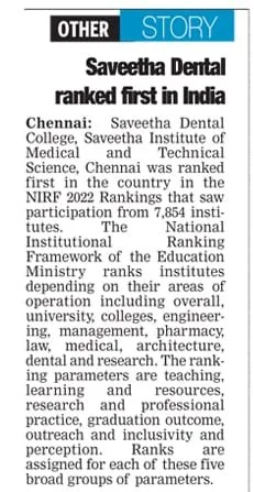 July 16, 2022 Saveetha Dental College NIRF Dental 1 st Ranking July 16, 2022 Saveetha Dental College Deccan Chronicle dated , 16.07.2022 Saveetha Dental College