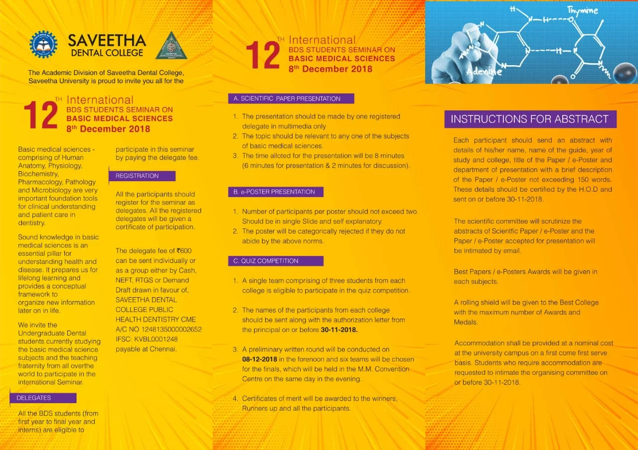 Dec 8 8:00 am08:00 12th International BDS Students Seminar - BASIC MEDICAL SCIENCES Saturday 8 December 2018 8:00 am 6:00 pm 08:00 18:00 Saveetha Dental College (map) Google Calendar ICS View Event →